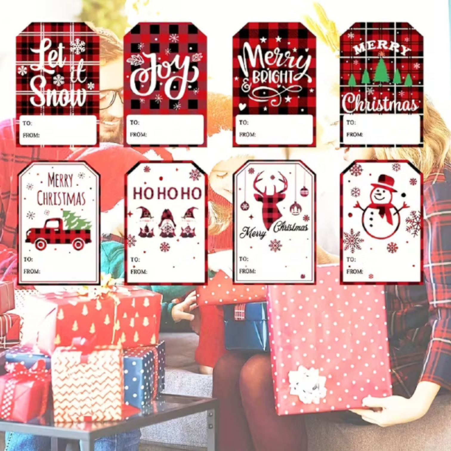 10 pcs Glossy Self-Adhesive Christmas Stickers Roll - Red & White Snowflakes, Holly, Bells, Gingerbread Men, Reindeer, Trees, Presents, Gift Tags with to/From Labels TU