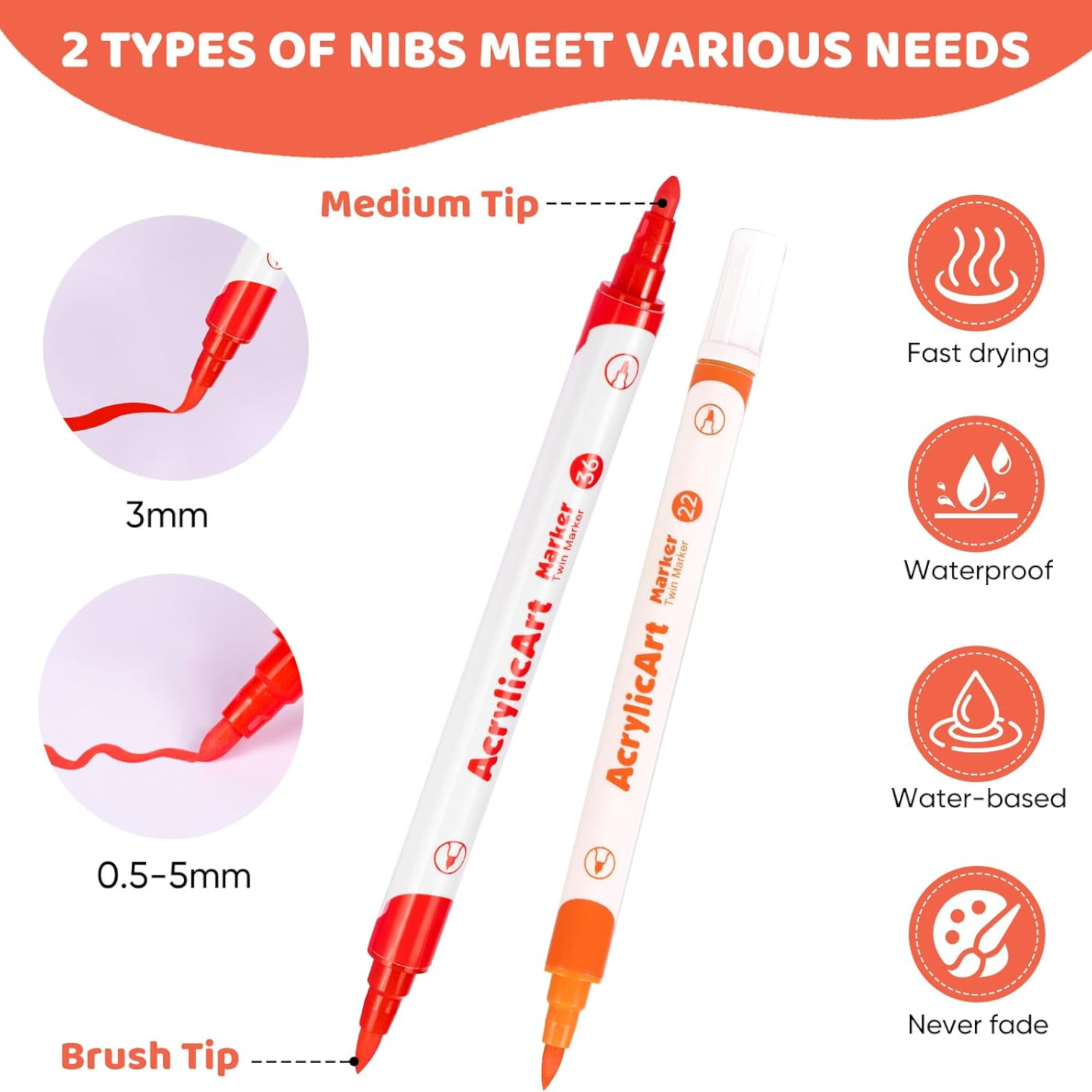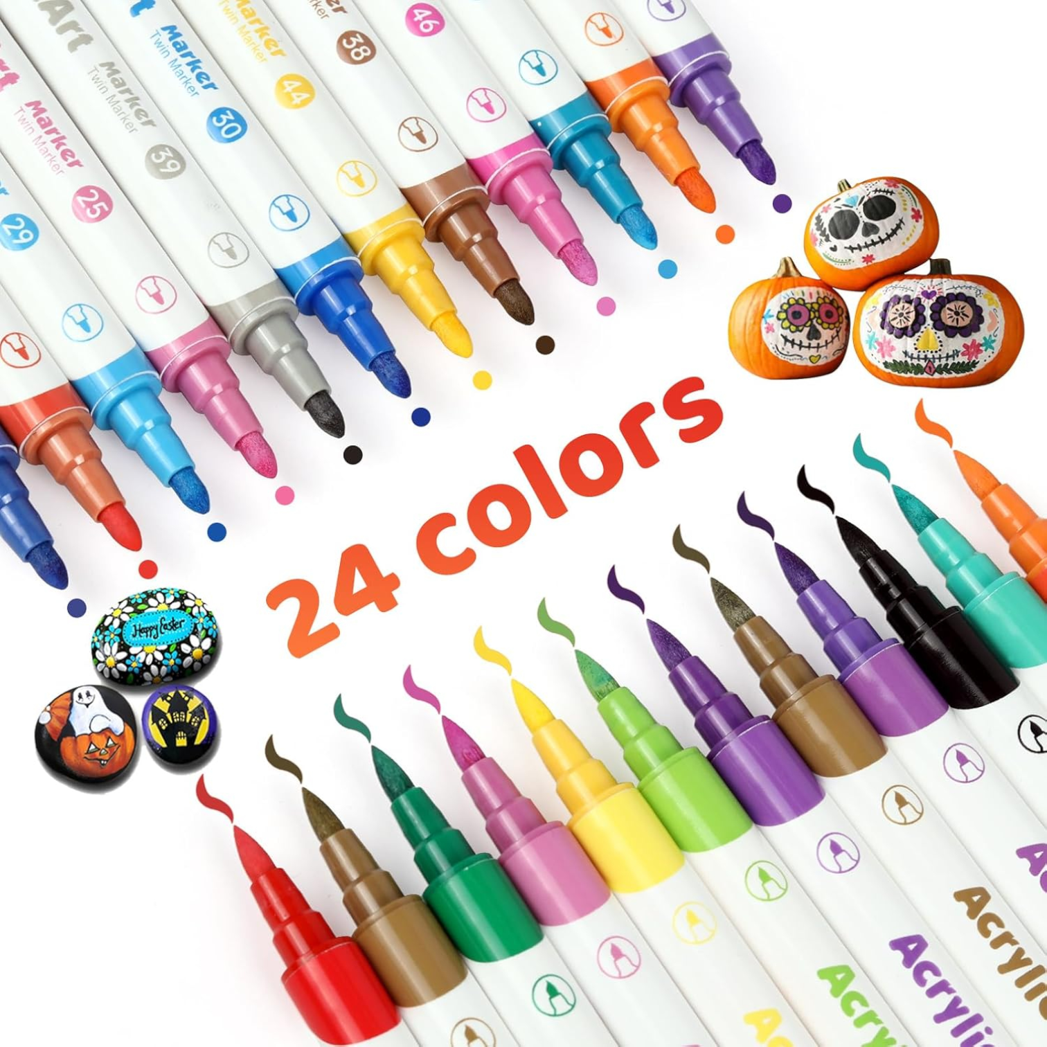 24 Colors Acrylic Paint Pens With Dual Tip - Medium and Brush Tips for Teens, Wood Crafts, Rock Painting, Canvas, Stone, Glass, Ceramic A