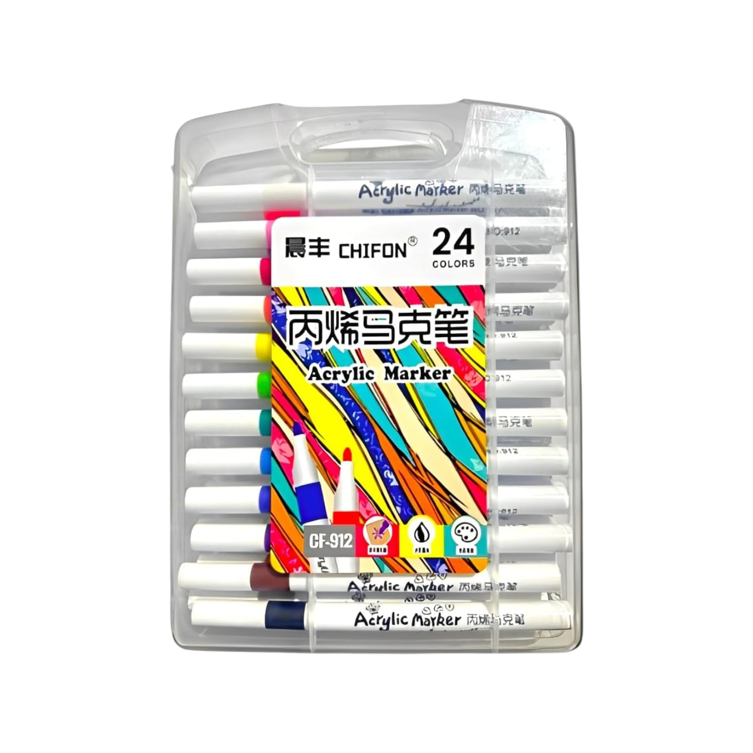 - Complete collection of 24 acrylic paint markers in vibrant colours suitable for multiple surfaces including ceramic, glass, wood, and rock