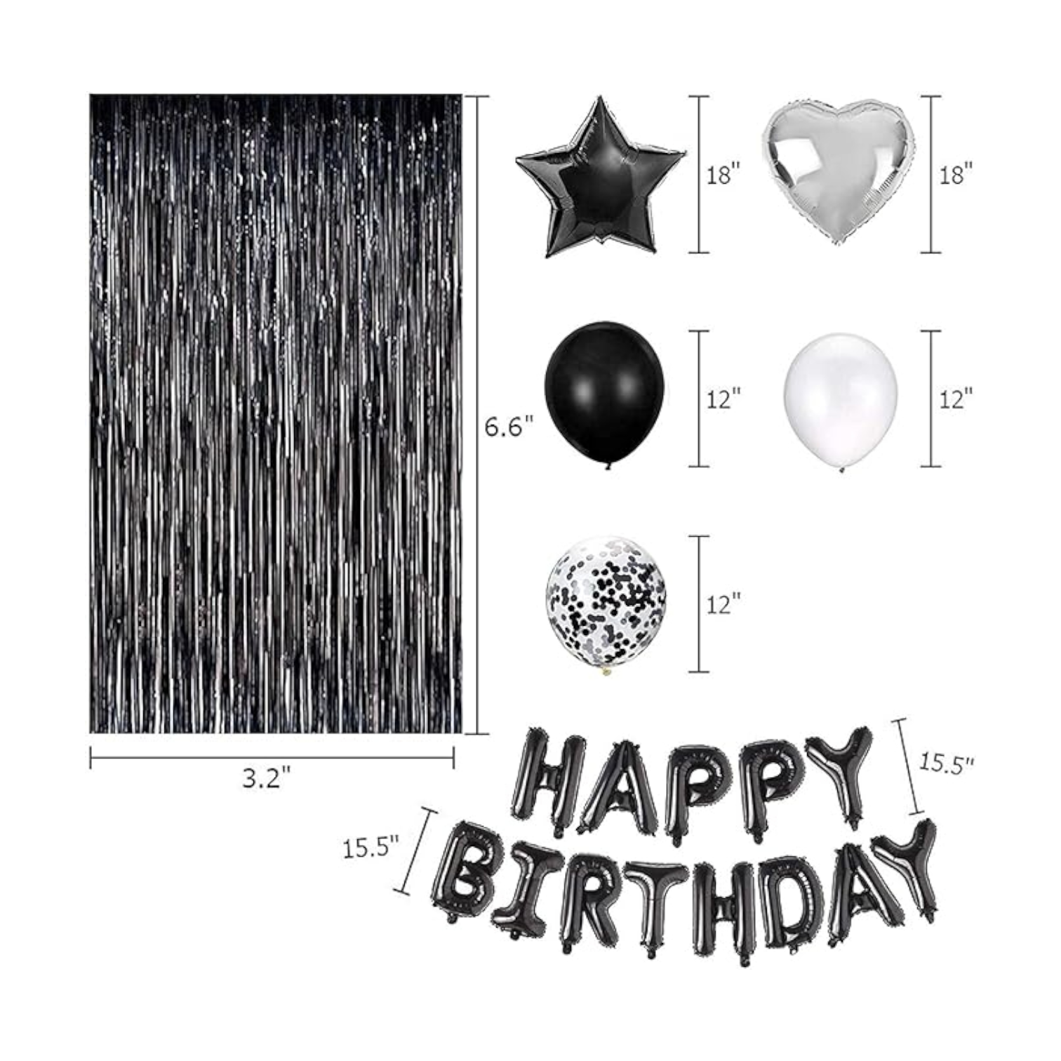 مجموعة ديكور حفلات أعياد الميلاد باللون الأسود مع لافتة بالونات عيد ميلاد سعيد، وبالونات قصاصات ورقية، وستارة هامشية من رقائق الألومنيوم لمستلزمات حفلات أعياد الميلاد