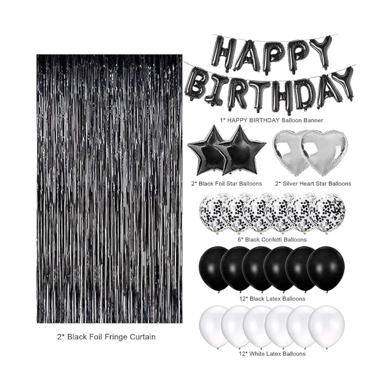 Black Birthday Party Decorations Set with Happy Birthday Balloons Banner, Confetti Balloons, Foil Fringe Curtain for Birthday Party Supplies A