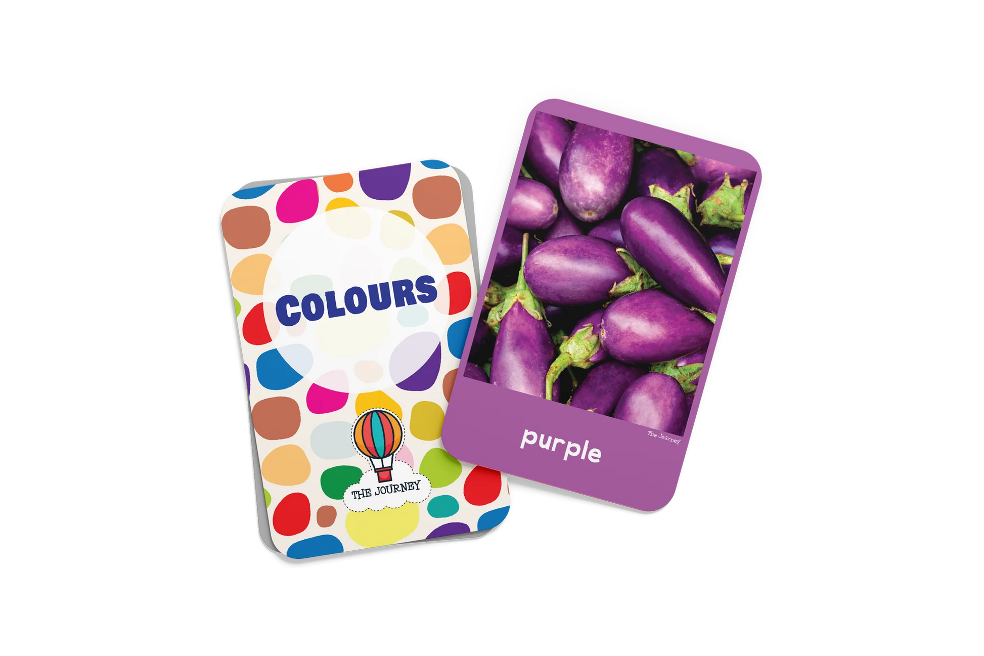 - Side 1: Features a picture of an item that matches the card's colour and three colour words underneath.