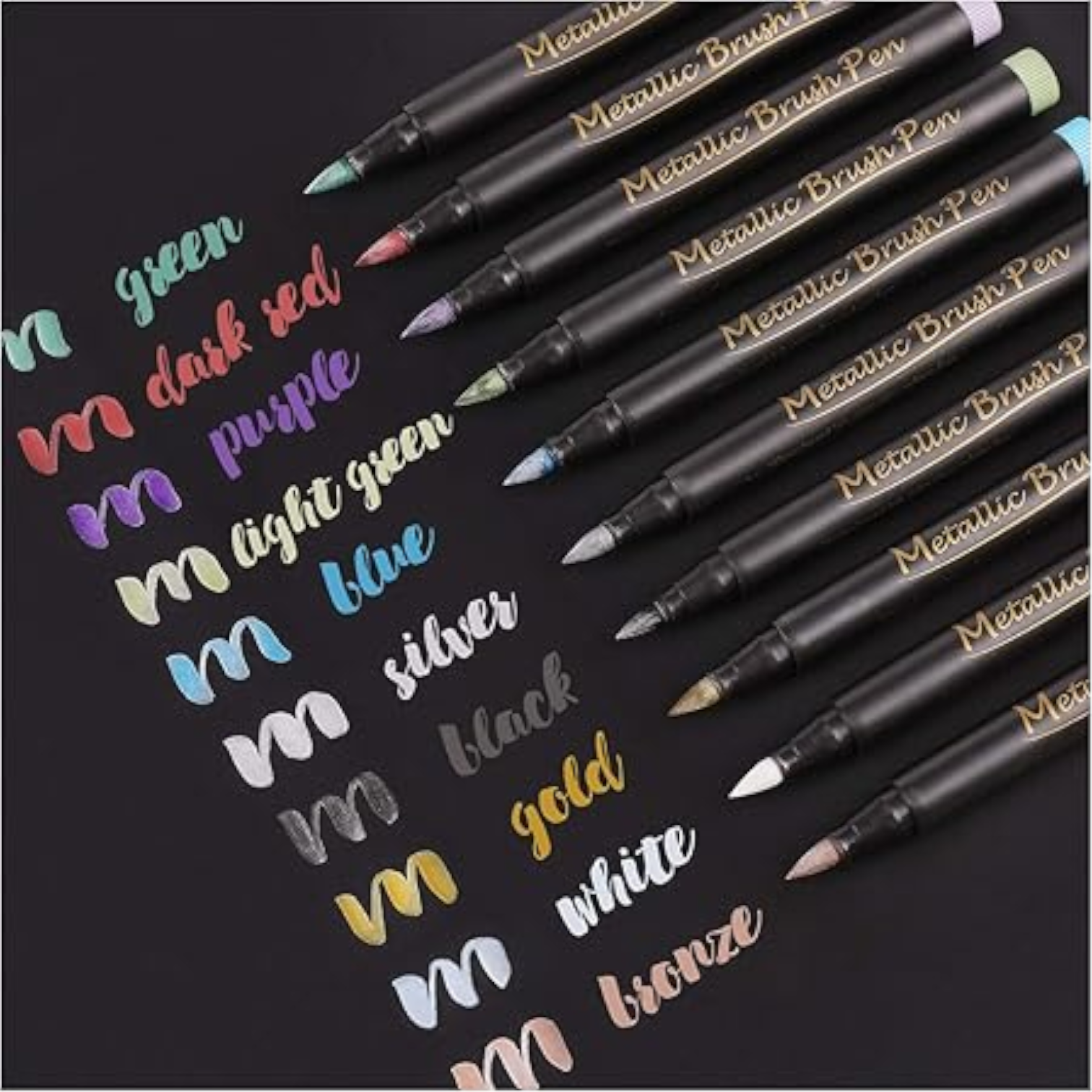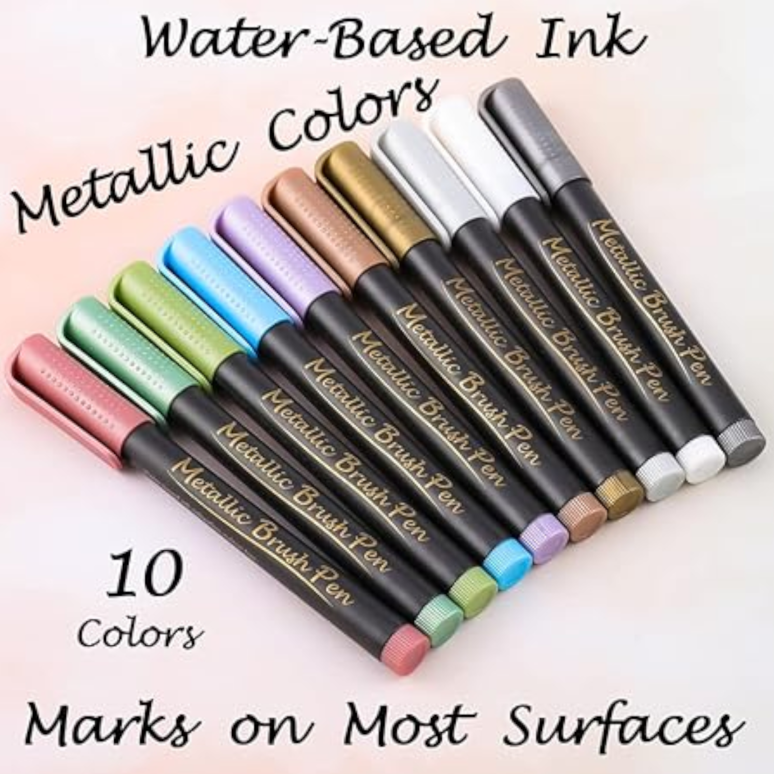 Metallic Brush Marker Pens - Metallic Pens Art Markers for Calligraphy, Brush Lettering, Black Paper, Rock Painting, Card Making, Scrapbooking, Fabric, Metal, Ceramics, Glass, Set of 10 A