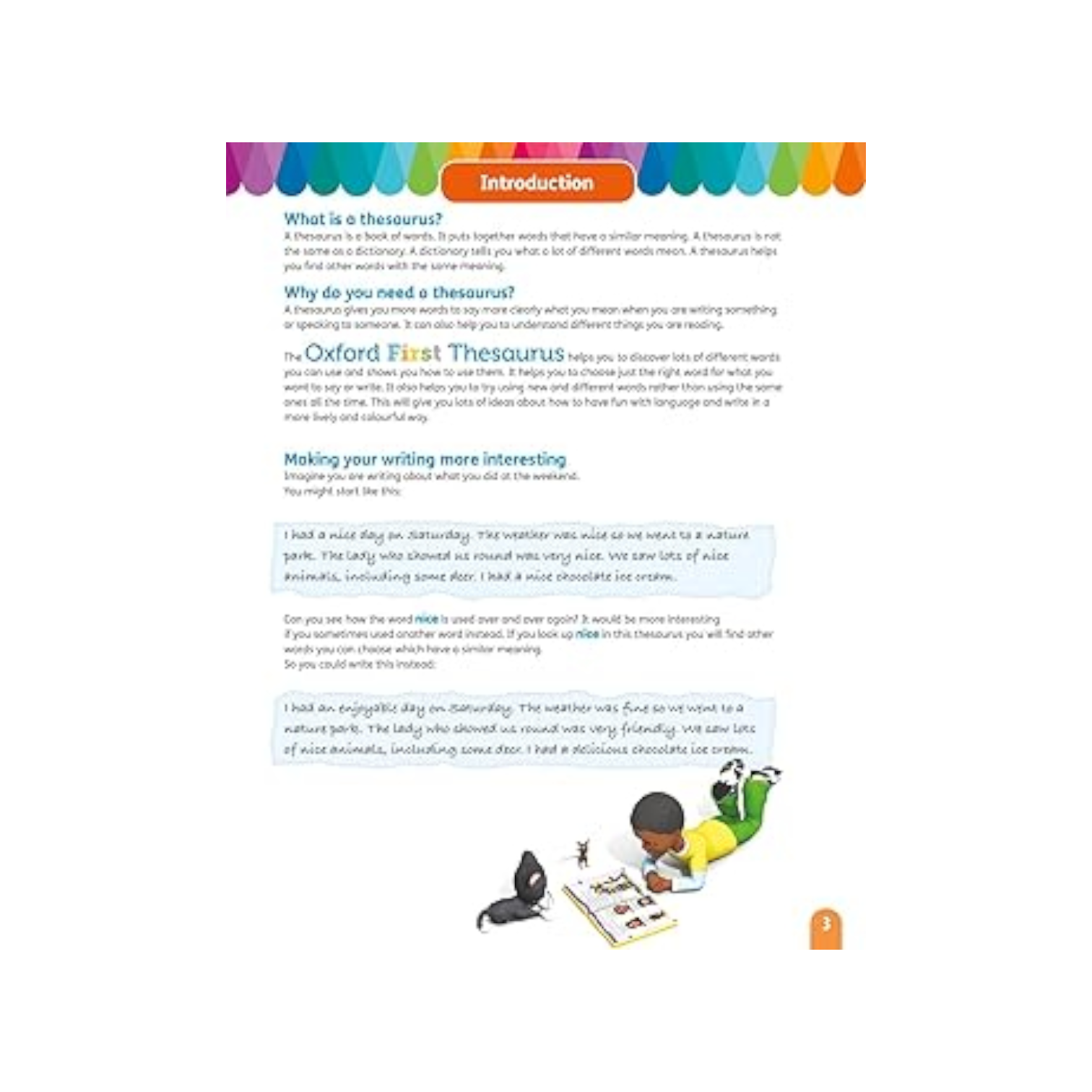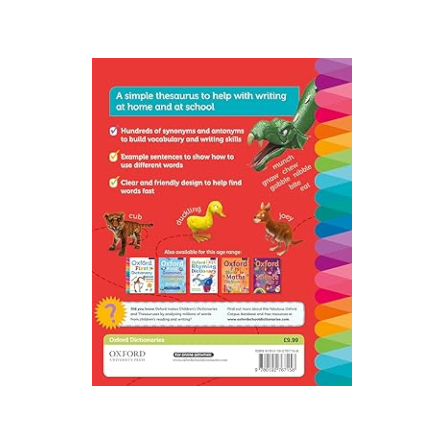 - Major new edition of the Oxford First Thesaurus in paperback updated to include more related words, synonyms and antonyms to develop children's writing skills and support comprehension.