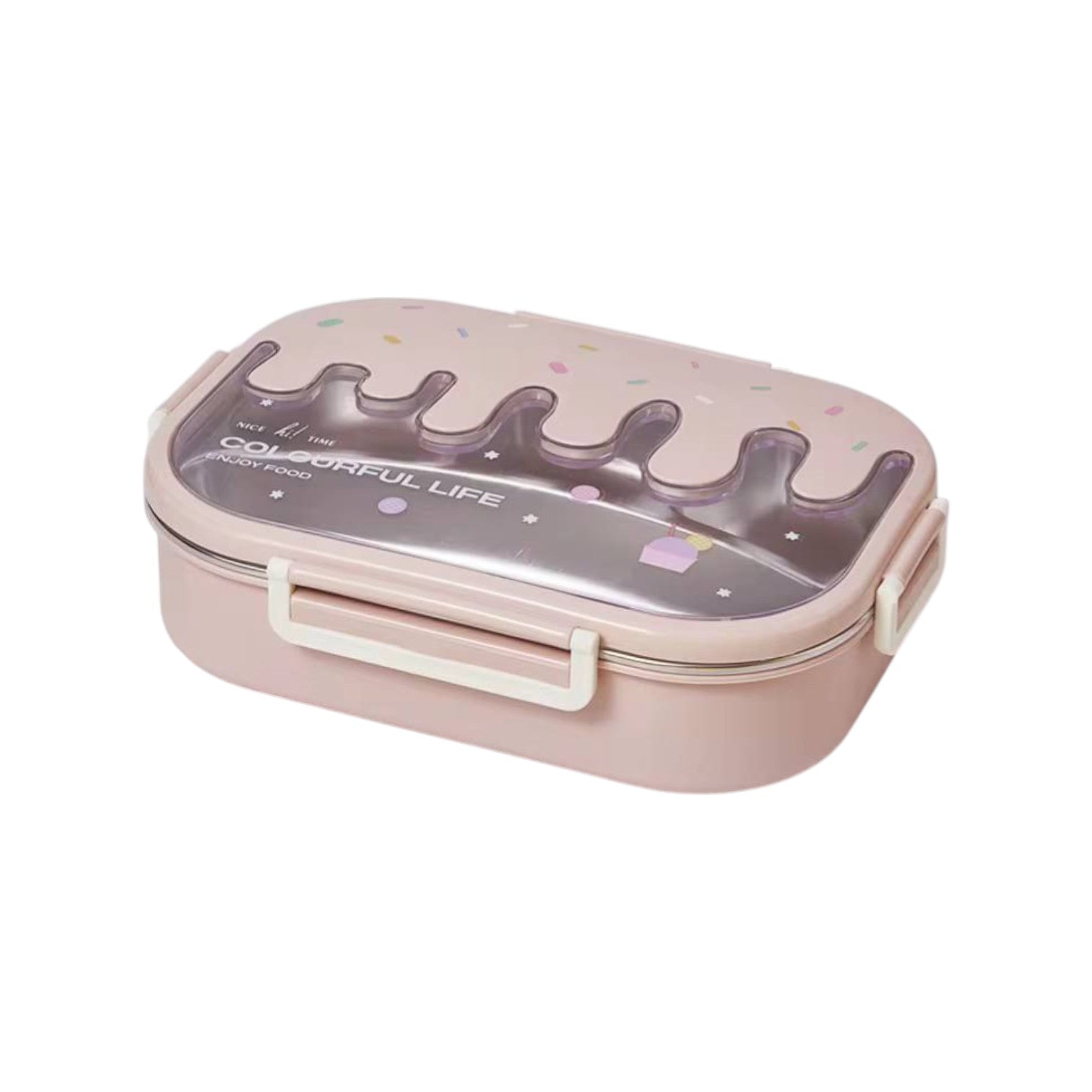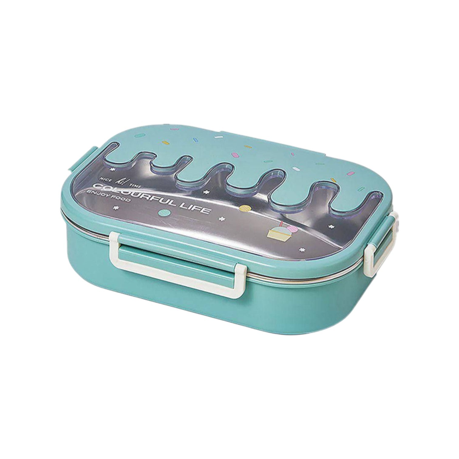 - The lunch box has a stainless steel part and a plastic part.